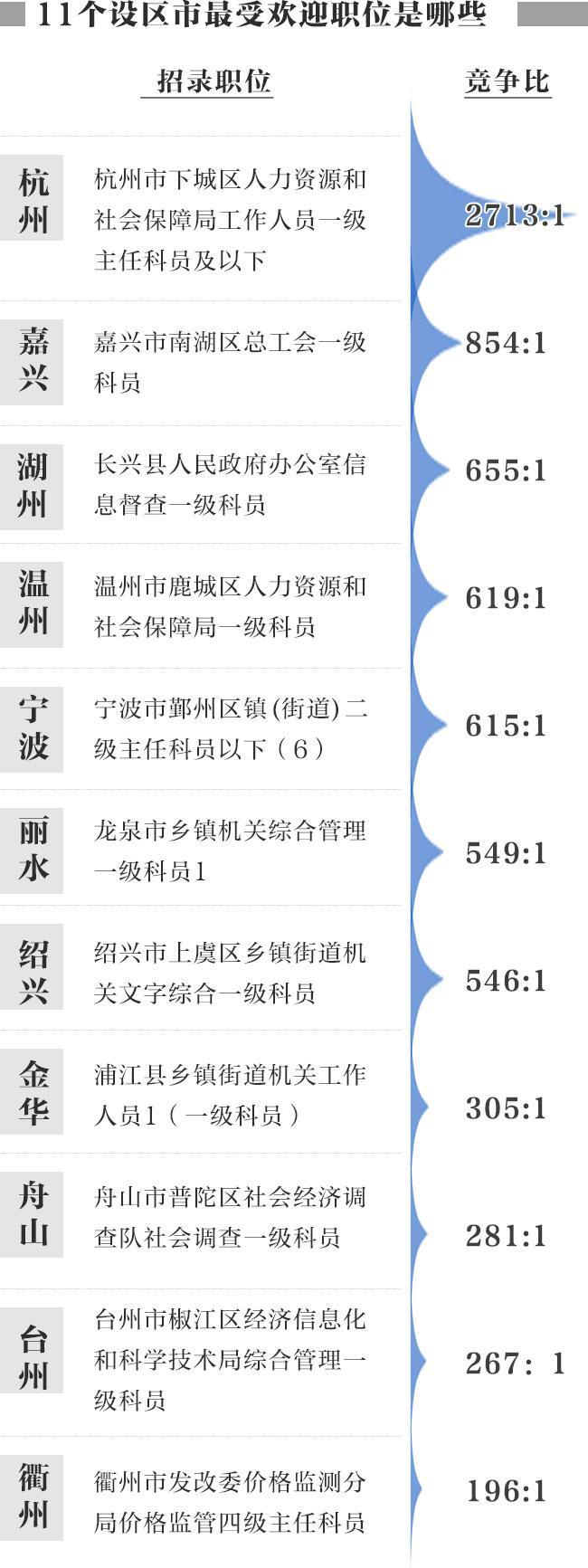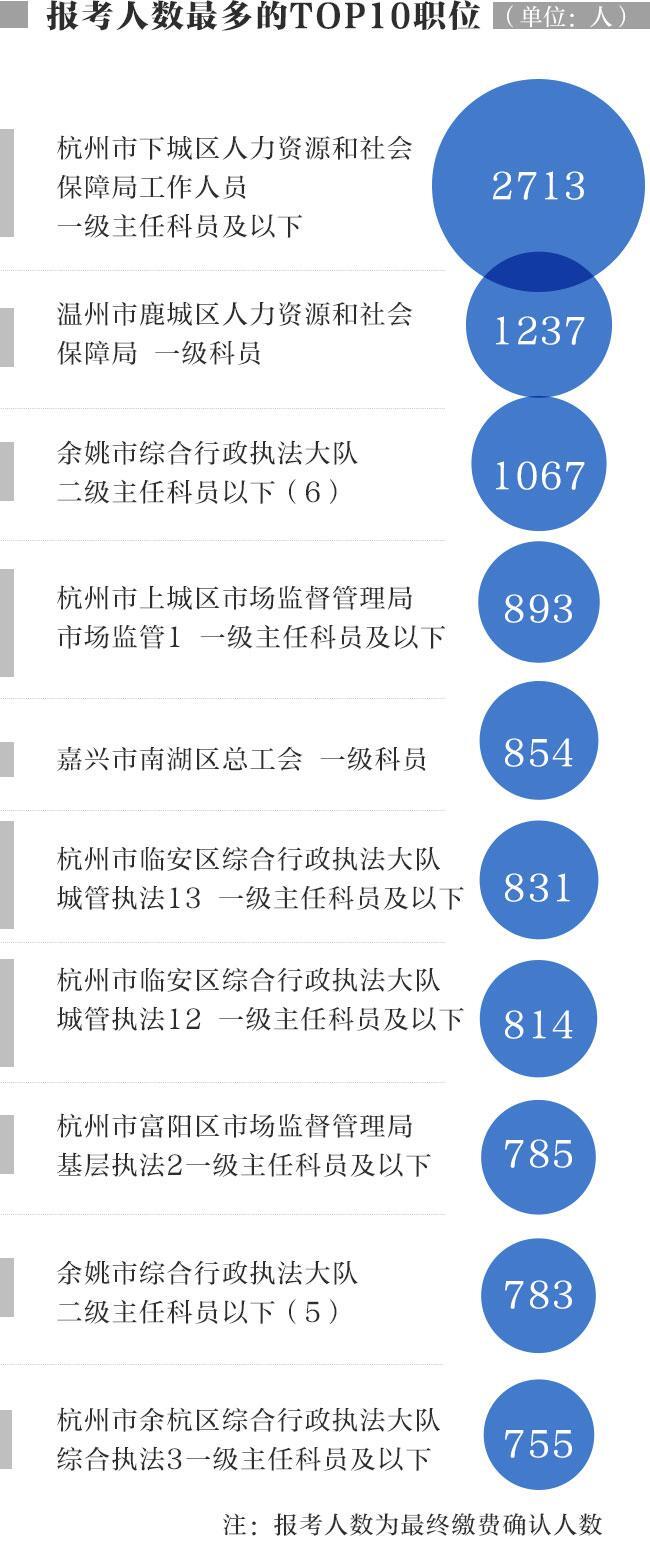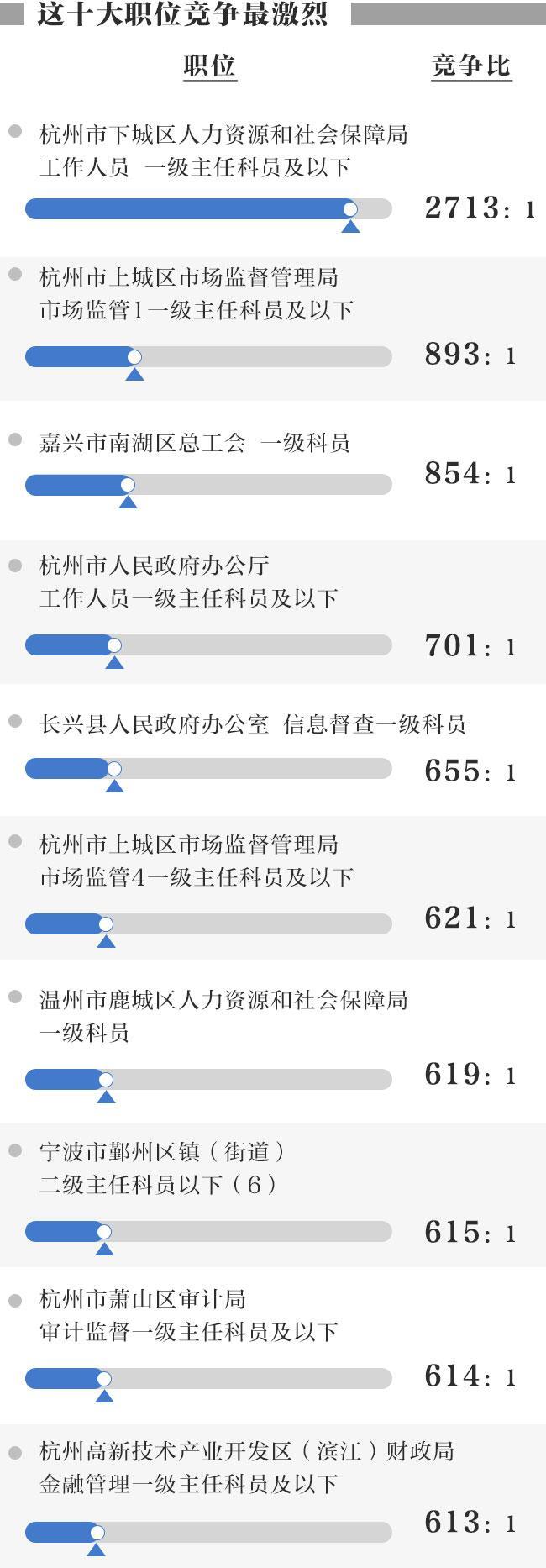 競爭最激烈的前十職位中,9個(gè)屬于基層類,1個(gè)屬于綜合類(杭州市人民政府辦公廳工作人員)。杭州市下城區(qū)人力資源和社會(huì)保障局“工作人員”一職錄取比例高達(dá)2713:1,這個(gè)“千里挑一”的職位也是報(bào)考人數(shù)最多的。在戶籍要求上,除了“寧波市鄞州區(qū)鎮(zhèn)(街道)二級(jí)主任科員”一職要求寧波市戶籍外,其他職位均不設(shè)戶籍要求。而在工作年限方面,僅有“杭州市人民政府辦公廳工作人員”一職要求2年以上基層工作經(jīng)歷。 從今年的報(bào)考情況來看,不限專業(yè)、不限工作年限、不限戶籍的基層類職位最受考生青睞。