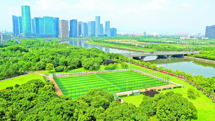 8月5日,空中俯瞰義烏江兩岸的江濱綠廊等地一片綠樹成蔭,與周圍現(xiàn)代化的城市建筑群有機融為一體,賦予了城市無限生機與活力,成為夏日里商城一道美麗綠色風景線。