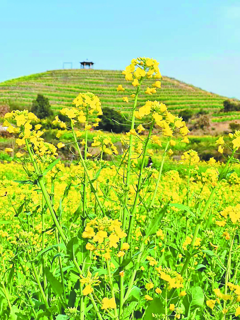 又是一年春伊始,陽(yáng)光明媚,萬物可愛。近日,由于氣溫回升,我市各地油菜花開始競(jìng)相綻放,給初春帶來了暖意。在赤岸鎮(zhèn)尚陽(yáng)村,一片金黃色的油菜花海靜悄悄盛開,吸引了游客紛至沓來。 站在尚陽(yáng)村的環(huán)村路邊,遠(yuǎn)處的山上、近處的梯田里,五個(gè)山頭面積達(dá)300余畝盛開的油菜花,猶如一條條金黃的綢帶,環(huán)繞著山巒,蜂飛蝶舞,春意盎然,成了義烏市民春天最不能錯(cuò)過的美景。 “這片油菜花一山更比一山高,搭配著田間野道上五彩斑斕的風(fēng)車小路,以及山頂清風(fēng)常伴的涼亭,無論往哪個(gè)方向走,都能發(fā)現(xiàn)一處新的美景,都會(huì)有不同的游玩體驗(yàn)。”從佛堂趕來游玩的劉女士感慨,自己真的來對(duì)了。 這片油菜花田位于赤岸鎮(zhèn)西南的尚陽(yáng)村。該村莊坐落于義烏市最高山大寒尖腳下,三面環(huán)山,發(fā)源于高陂山的溪流自東向西逆流引入村中,繞村穿村于每家每戶的門前屋后,形成戶戶皆有埠頭的壯觀勝景。尚陽(yáng)最著名的還有一處尚陽(yáng)老街,其東西走向,全長(zhǎng)800余米,中間略彎曲,首尾不能相望,巷弄縱橫交錯(cuò),寬窄不一,構(gòu)成魚骨架形狀。老街內(nèi)的特色商鋪一間連著一間,與油菜花田遙遙相望。游客在油菜花田踱步、拍照,累了還能到尚陽(yáng)老街吃個(gè)紅糖麻糍,喝碗冰糖雪梨,豈不快哉。 吹苑野風(fēng)桃葉碧,壓畦春露菜花黃。據(jù)悉,這片油菜花田原來只零星種植了一些油菜花,此后,商城集團(tuán)旅游發(fā)展公司與尚陽(yáng)村結(jié)對(duì),根據(jù)該村特色,因地制宜,經(jīng)農(nóng)田墾造,打造了五個(gè)山頭農(nóng)業(yè)旅游開發(fā)幫扶項(xiàng)目,這才變成了漫山遍野的油菜花梯田。油菜花的花期在2-4月,現(xiàn)在,正值花蕊萌芽時(shí)。此前,該村還將油菜花品種作了改良,花期更長(zhǎng)、觀賞性更強(qiáng)。據(jù)悉,到了春天,山頭的梯田花!爸鹘恰庇謺(huì)換成向日葵,均是適用于“古法煉油”的油料作物。 此刻,連片的油菜花迎春綻放,金燦燦的花海把鄉(xiāng)村點(diǎn)綴得異常美麗,連綿不斷的油菜花就像一張金色的大地毯,將田野緊緊覆蓋,微風(fēng)輕拂,花香撲鼻而來,沁人心脾。近處菜花燦爛,蜂飛蝶舞,遠(yuǎn)處村舍依依,勾畫出一幅美麗的田園畫卷。 |