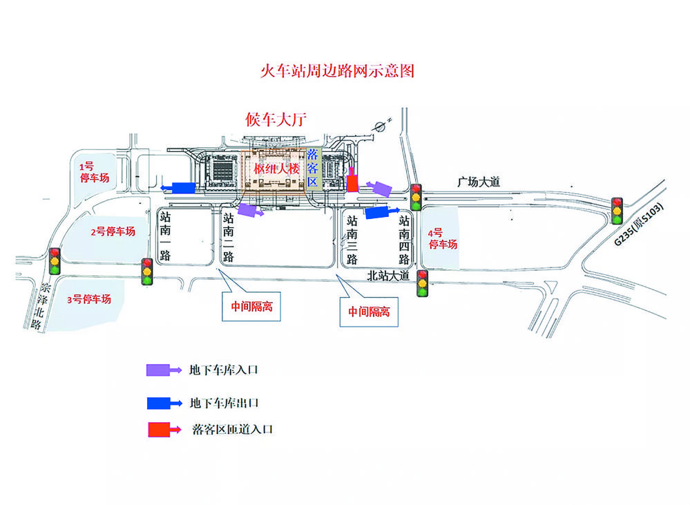 昨日,記者從市公安局交警大隊了解到,因義烏火車站樞紐大樓即將部分啟用,站區(qū)將新增一條進出通道和一個地下停車場,讓接送客更加便捷。與此同時,廣場大道和南站二路、三路、四路也將同步開通。 為了讓市民提前了解與熟悉線路,交警部門提供了車輛進出火車站的交通線路以及相關(guān)位置示意圖。其中,社會車輛在保持原有的“北站大道—宗澤北路—火車站內(nèi)部”的線路不變基礎(chǔ)上,增加了經(jīng)由樞紐大樓進出火車站的線路。 進樞紐大樓線路為:1.北站大道—站南四路—廣場大道—進入樞紐大樓地下車庫(3號入口)或者地面二層落客平臺;2.城北路—G235(原S103)—廣場大道—地下車庫(3號入口)或者地面二層落客平臺;3.北站大道—站南一路—廣場大道—地下車庫(2號入口);4.北站大道—站南二路—廣場大道—地下車庫(2號入口)。 出樞紐大樓線路為:1.樞紐大樓地面二層落客平臺—廣場大道—站南四路或G235(原S103);2.地下車庫(1號出口)—廣場大道—站南一路或者掉頭往站南四路、G235通行;3.地下車庫(2號出口)—廣場大道—只能右轉(zhuǎn)走站南四路。 此外,公交車將調(diào)整為由宗澤北路進入—站南一路駛出。公交乘客進出火車站線路保持不變;出租車將調(diào)整為由宗澤北路進入—落客區(qū)下客—繞行由宗澤北路駛出。出租車乘客進出火車站線路保持不變。 需要注意的是,為確;疖囌局苓吔煌ㄓ行颉惩、安全,廣場大道、站南一路、站南二路、站南三路、站南四路上嚴禁停車,請廣大市民自覺遵守交通法律法規(guī),服從現(xiàn)場管理人員指揮。受廣場大道道路上方匝道限制,廣場大道限高4.2米,廣場大道(站南一路—站南四路)、站南一路、站南鐵路、站南三路、站南四路禁止1.5噸(含)以上貨車、危化品車輛通行,以確保安全。北站大道沿線開口較多,且路口間距較近,容易引發(fā)擁堵,廣大市民須提前通過導(dǎo)航地圖了解實時交通路況,盡量繞行,走城北路—G235—廣場大道。 |