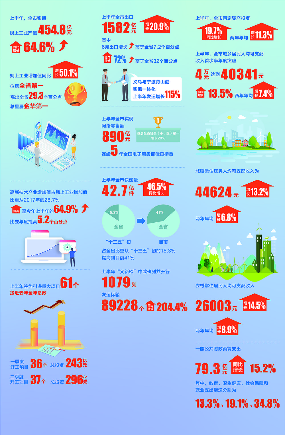 上半年,義烏圍繞高質(zhì)量高水平建設(shè)世界小商品之都,打造共同富裕示范地,深入推進(jìn)經(jīng)濟(jì)和城市轉(zhuǎn)型,發(fā)展穩(wěn)中向好,我市經(jīng)濟(jì)在去年最先復(fù)工復(fù)產(chǎn)的高基數(shù)下實(shí)現(xiàn)“半年紅”。 經(jīng)初步核算,義烏上半年實(shí)現(xiàn)地區(qū)生產(chǎn)總值815.7億元,按可比價(jià)計(jì)算,同比增長(zhǎng)15.5%,高于全省和金華,兩年平均增長(zhǎng)8.0%;全市集貿(mào)市場(chǎng)總成交額1112.1億元,同比增長(zhǎng)48.0%。 工業(yè)經(jīng)濟(jì)強(qiáng)勢(shì)崛起 近年來,義烏堅(jiān)持項(xiàng)目為王,持續(xù)招大引強(qiáng),創(chuàng)新推動(dòng)產(chǎn)業(yè)轉(zhuǎn)型。過去五年累計(jì)引進(jìn)億元以上重大項(xiàng)目270個(gè),“無中生有”打造信息光電和汽車制造兩大千億級(jí)現(xiàn)代制造業(yè)集群。全球光伏行業(yè)排名前五的企業(yè)有4個(gè)落戶義烏,第一的晶科、第二的晶澳、第三的天合光能和第五的東方日升。綠色動(dòng)力小鎮(zhèn)也落地包括吉利在內(nèi)的8個(gè)項(xiàng)目。 隨著光伏光電龍頭企業(yè)的紛紛落地開工投產(chǎn)見效,對(duì)義烏產(chǎn)業(yè)總值拉動(dòng)愈加明顯。 今年以來,義烏更是以季度為單位抓開工、簽約,又新培育芯片半導(dǎo)體產(chǎn)業(yè),謀劃芯片小鎮(zhèn),成立半導(dǎo)體產(chǎn)業(yè)母基金,以大項(xiàng)目謀劃未來產(chǎn)業(yè)。目前已落地中芯、韋爾、瑞測(cè)等項(xiàng)目。 起舞“雙循環(huán)” 韌勁十足 受益于自貿(mào)試驗(yàn)區(qū)、綜合保稅區(qū)、跨境電商綜試區(qū)、進(jìn)口貿(mào)易促進(jìn)創(chuàng)新示范區(qū)等政策疊加,義烏助力構(gòu)建國(guó)內(nèi)國(guó)際“雙循環(huán)”新發(fā)展格局,市場(chǎng)采購(gòu)貿(mào)易方式作用顯著,多種貿(mào)易方式全面開花;貿(mào)易便利化改革持續(xù)深入,義烏國(guó)際陸港成為寧波舟山港第六港區(qū),“市場(chǎng)采購(gòu)+一般貿(mào)易”拼箱轉(zhuǎn)關(guān)出口成為全國(guó)唯一試點(diǎn),在全國(guó)率先推行涉企經(jīng)營(yíng)許可“承諾即入”改革,構(gòu)建與國(guó)際慣例接軌、可自由開展出口、進(jìn)口和轉(zhuǎn)口貿(mào)易的市場(chǎng)環(huán)境和體制機(jī)制,積極打造數(shù)字化雙循環(huán)戰(zhàn)略節(jié)點(diǎn),成為全球中小微企業(yè)的貿(mào)易天堂。 義烏堅(jiān)持將電子商務(wù)定位為戰(zhàn)略性、先導(dǎo)性產(chǎn)業(yè)進(jìn)行重點(diǎn)培育,形成了線上線下融合、極具特色的縣域電子商務(wù)經(jīng)濟(jì)體,網(wǎng)絡(luò)零售額長(zhǎng)時(shí)間位居全省首位,正日益崛起成為全球矚目的“電商之都”。 義烏堅(jiān)持把快遞物流行業(yè)作為推動(dòng)市場(chǎng)轉(zhuǎn)型升級(jí)的重要著力點(diǎn)和改革創(chuàng)新的突破口,在全國(guó)率先完成快遞園區(qū)建設(shè),物流線點(diǎn)實(shí)現(xiàn)了全國(guó)重要城市全覆蓋,成為全國(guó)最具影響力的快遞集聚中心,獲批全省唯一國(guó)家級(jí)“現(xiàn)代物流創(chuàng)新發(fā)展城市試點(diǎn)”等。 “義新歐”中歐班列是義烏踐行國(guó)家“一帶一路”倡議和對(duì)外開放的重要載體,更是義烏“無中生有”的又一創(chuàng)新奇跡。通過六年半的持續(xù)奔跑,已經(jīng)發(fā)展成為運(yùn)行線路最多、裝載效率最高的中歐班列,有力促進(jìn)了義烏與班列沿線國(guó)家地區(qū)的經(jīng)貿(mào)往來和多方位、多層面的溝通交流。 城鄉(xiāng)蝶變 幸福提速 近年來,義烏堅(jiān)持“一個(gè)市”的理念,推進(jìn)全域大提升,完成老城區(qū)5.78平方公里城市有機(jī)更新,開工建設(shè)雙江水利樞紐、義烏植物園、高鐵全高架站房、新CBD等重大項(xiàng)目,全面拉開都市大框架。 推進(jìn)農(nóng)業(yè)農(nóng)村現(xiàn)代化,提出“中國(guó)眾創(chuàng)鄉(xiāng)村”主題定位,有機(jī)融合多規(guī)合一、國(guó)企結(jié)對(duì)、產(chǎn)業(yè)植入,形成280公里市域美麗鄉(xiāng)村精品大環(huán)線。 推進(jìn)生態(tài)源頭治理,連續(xù)四年奪得“五水共治”大禹鼎,綠色發(fā)展指數(shù)躍居全省第一,榮獲國(guó)家生態(tài)文明建設(shè)示范市。 推動(dòng)民生服務(wù)倍增,對(duì)老人、病人、低收入者、殘疾人、婦女、兒童細(xì)致關(guān)懷,實(shí)施百園工程等教育倍增計(jì)劃,兒童醫(yī)院等啟動(dòng)建設(shè),市民有了家門口的省級(jí)醫(yī)院專家。 |