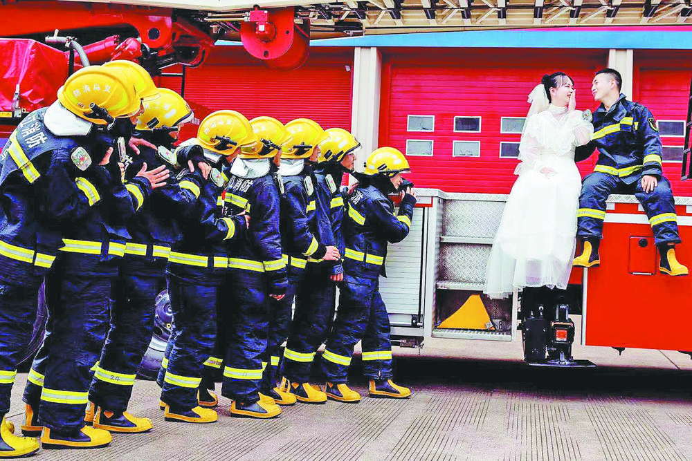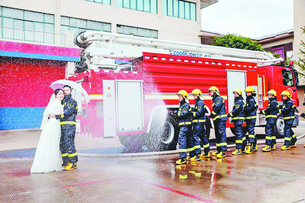 在普通人眼里,拍攝一組婚紗照并不算什么難事,但對(duì)24小時(shí)執(zhí)勤備戰(zhàn)的消防指戰(zhàn)員而言,卻不那么容易。金衛(wèi)存是市消防救援支隊(duì)北苑特勤站的一名消防戰(zhàn)斗員,他曾向相戀5年的愛人陳燕霞承諾:“等我有空的時(shí)候,我們一起拍個(gè)美美的婚紗照。”可好事多磨,計(jì)劃幾經(jīng)推遲?嗟榷鄷r(shí)的新娘陳燕霞決定帶上攝影師,將自己“快遞”送上門,在北苑特勤站營(yíng)區(qū)內(nèi)拍攝婚紗照。 紅色的云梯車、橙色的搶險(xiǎn)服、藍(lán)色的滅火服等消防元素,配上潔白的婚紗,重現(xiàn)了消防員訓(xùn)練、救援的場(chǎng)景,傳遞了消防正能量。一張照片中,大雨滂沱,金衛(wèi)存身穿藍(lán)色滅火服,抱著身著白色婚紗的新娘,再現(xiàn)“火災(zāi)救生”場(chǎng)景。另一張,金衛(wèi)存被救援繩吊在半空中,重現(xiàn)了“現(xiàn)場(chǎng)救援”場(chǎng)景。 七夕前夕,這套特別的婚紗照,一下子“擊中”了眾多網(wǎng)友的心。 據(jù)悉,27歲的金衛(wèi)存,加入消防救援隊(duì)伍9年,參加工作以來,他熱愛本職,苦練精兵,取得多項(xiàng)優(yōu)異成績(jī)。提起消防救援經(jīng)歷,他滿臉自豪。他說,記得剛下隊(duì)沒多久,自己首次“作戰(zhàn)”是撲救一處廠房火災(zāi)。作為搶險(xiǎn)班的戰(zhàn)斗員,金衛(wèi)存進(jìn)入火災(zāi)現(xiàn)場(chǎng),搜救被困人員。“班長(zhǎng)帶我們4人進(jìn)去內(nèi)攻。火場(chǎng)房間內(nèi),煙霧彌漫,伸手不見五指,火場(chǎng)溫度又高!彼f,救援危險(xiǎn),自己也沒帶怕的。但提到另一半陳燕霞,金衛(wèi)存滿是歉意!拔腋杏X特別對(duì)不起她,因?yàn)楣ぷ鞯脑蛞恢蓖七t婚禮,所以內(nèi)心感覺很虧欠她!庇幸淮危愌嘞紒黻(duì)里接金衛(wèi)存回家,剛收拾好行李,警鈴就響起了,金衛(wèi)存第一時(shí)間換上救援服出警。陳燕霞不放心,就在隊(duì)里一直等了兩個(gè)多小時(shí)。“眼看著他跑出去出警,心里還是挺緊張的,后面等了很久還不見回來,就越來越擔(dān)心。直到看見他回來,懸著的心總算放下了!标愌嘞颊f。 剛戀愛時(shí),一次,陳燕霞偷偷來隊(duì)里看望金衛(wèi)存,發(fā)現(xiàn)他在三伏天,頂著烈日身穿厚厚的消防戰(zhàn)斗服,背著空氣呼吸器在進(jìn)行訓(xùn)練!懊撓聭(zhàn)斗服的一瞬間,看到他身上的汗水,第一次感受到了消防指戰(zhàn)員的辛苦,體會(huì)了他們的不容易,心里也多了份理解。”陳燕霞說。 “除了工作忙得沒時(shí)間照顧家里以外,其他都符合好丈夫的一切標(biāo)準(zhǔn)!毙履镪愌嘞荚u(píng)價(jià)金衛(wèi)存說,“他每次救援完,外表都狼狽不堪,我卻覺得他為了人民生命財(cái)產(chǎn)安全拼命的模樣最迷人。作為一名消防員的妻子,我很榮幸很驕傲,我能夠理解愛人工作的不容易,我做好了心理準(zhǔn)備,要做愛人最堅(jiān)強(qiáng)的后盾。” 他們拍的照片在網(wǎng)上流傳之后,很多網(wǎng)友羨慕不已,紛紛給“藍(lán)朋友”們點(diǎn)贊,并且送上祝福,還有網(wǎng)友稱贊這是見過的“最美新娘,最美婚紗照”。 |