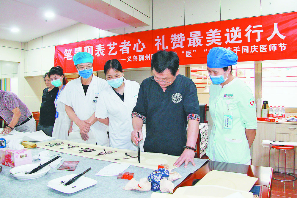 疫情期間,稠州醫(yī)院積極組織醫(yī)務(wù)工作者奔赴卡口防控、核酸檢測、助商助企等防控一線,用擔(dān)當(dāng)和堅(jiān)守詮釋了醫(yī)者學(xué)醫(yī)之初心、行醫(yī)之使命。“抗疫先鋒”“醫(yī)德高尚”“最美逆行者”……活動(dòng)現(xiàn)場,藝術(shù)家們揮毫潑墨,一幅幅書畫作品躍然紙上,醫(yī)務(wù)人員聽令而動(dòng)、救死扶傷、英勇逆行的形象,在筆墨流香間生動(dòng)展現(xiàn)。 此次活動(dòng)共向稠州醫(yī)院醫(yī)務(wù)人員贈(zèng)送書畫作品近百幅。醫(yī)務(wù)人員紛紛表示,今后將繼續(xù)做好本職工作,弘揚(yáng)抗疫精神,鞏固戰(zhàn)疫成果,全力守護(hù)市民健康。 |