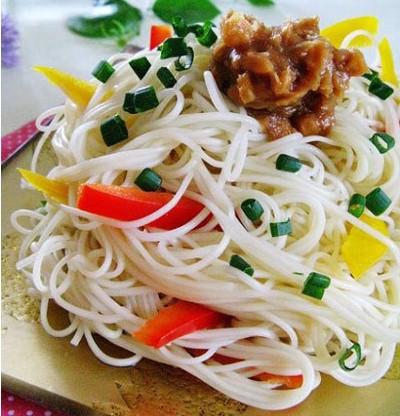 3、將彩椒與面條拌勻后最后淋上調(diào)好的醬汁,撒上蝦夷蔥碎即可。