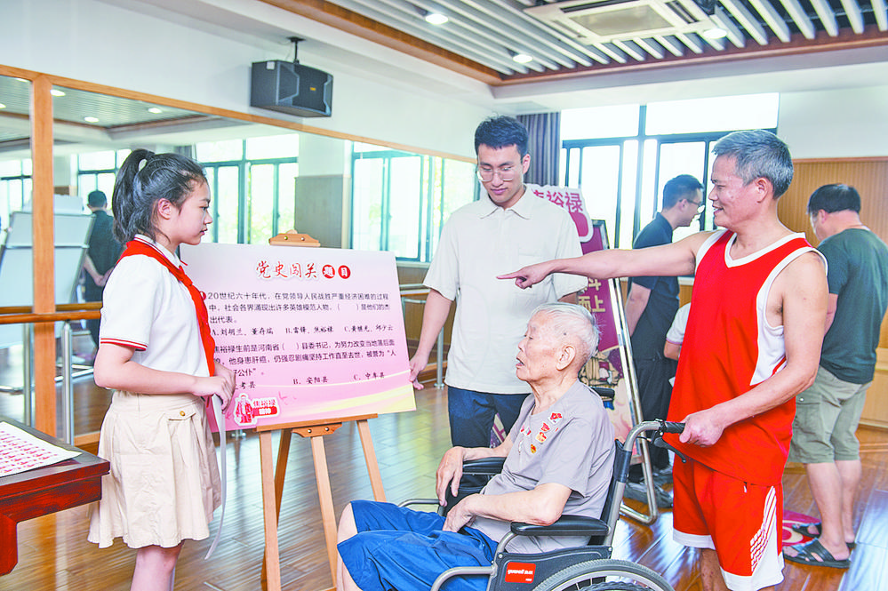 活動中,來自藝術(shù)學校、實驗小學、工商學院等學校的學生獻上精彩的文藝演出,國貿(mào)學校的師生現(xiàn)場為老同志制作手工茶點,并進行茶藝表演。演出結(jié)束后,老干部們積極參與“黨史知識闖關(guān)”小游戲,現(xiàn)場氣氛輕松愉快、其樂融融。