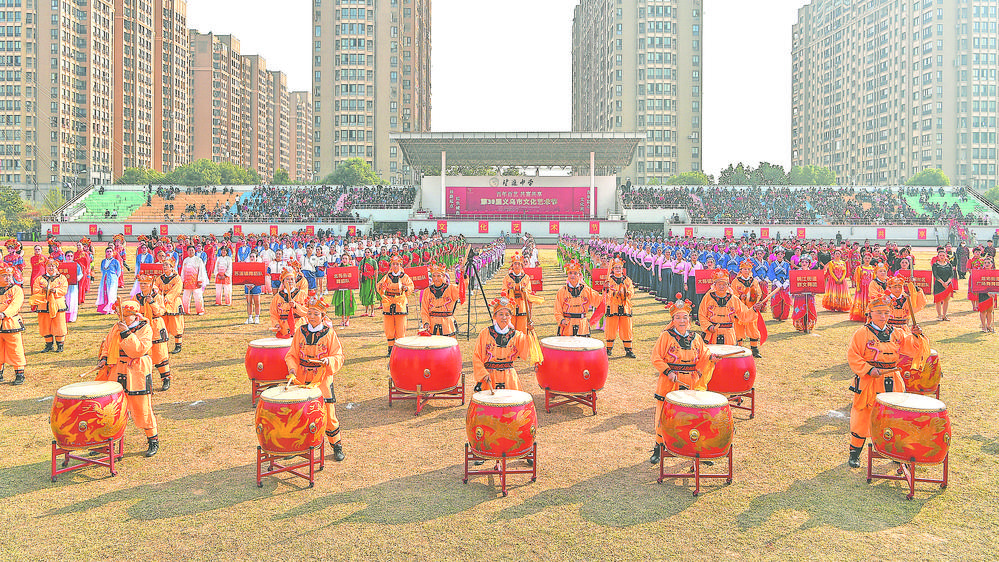 文化因傳播而繁盛,文明因交流而多彩。昨日,由市委宣傳部、市文旅局、市文聯(lián)主辦的第30屆義烏市文化藝術(shù)節(jié)如期啟幕,為市民獻(xiàn)上一場(chǎng)文化盛宴。 文化交融 綻放精彩火花 要問當(dāng)天義烏哪里的煙火氣、文藝味最濃郁?當(dāng)屬第30屆義烏市文化藝術(shù)節(jié)開幕式。儀式上,各鎮(zhèn)街(民間)文藝精品展演如涓涓細(xì)流潤(rùn)澤烏傷大地,帶給全場(chǎng)千余名觀眾莫大的藝術(shù)享受,激發(fā)大家心中深沉而熱烈的家國(guó)情懷。精神之魂,文以化之,文以鑄之。傳統(tǒng)美術(shù)、傳統(tǒng)技藝等30多個(gè)非遺項(xiàng)目走進(jìn)“哆唻嘻”非遺市集,活動(dòng)現(xiàn)場(chǎng)好不熱鬧。經(jīng)過手藝人的一番操作,精美的百子燈、靈動(dòng)有趣的捏面人、美輪美奐的木雕作品等一一呈現(xiàn)。 作為每年一次文化盛宴的重頭戲,今年的開幕式文藝演出別具一格,非遺項(xiàng)目凸現(xiàn)出義烏濃郁的地方色彩和民俗風(fēng)貌。踩街活動(dòng)上,在望道中學(xué)操場(chǎng)一側(cè),30余米高的龍虎大旗在鑼鼓和歡呼聲中高高屹立、迎風(fēng)飄揚(yáng)。和著大鼓的“咚咚”聲,江東街道東洲大鼓隊(duì)登場(chǎng)了,鏗鏘有力的鼓點(diǎn)聲,迅速點(diǎn)燃了全場(chǎng)觀眾的熱情。全省非遺代表性項(xiàng)目后宅高蹺的表演者們頭戴公子帽,上穿黃馬褂,下穿紅色高腳褲,腳綁一米多的高蹺棍,形式多樣地展現(xiàn)著走高蹺的技藝性。這項(xiàng)傳承了800多年的民俗文化娛樂活動(dòng),在義烏話中稱為“走長(zhǎng)腳儂”,用來紀(jì)念始祖傅芷堅(jiān)貞不屈、百折不撓的高尚品德。 金華市級(jí)非物質(zhì)文化遺產(chǎn)拉線獅子表演開始了,“獅子”或上或下,或前或后,都由拉線人所拉線的長(zhǎng)短距離所決定。由樂隊(duì)中的一聲先鋒嗩吶聲當(dāng)號(hào)令,扛著獅子房的壯漢,馬上停住腳步,同時(shí)用“擔(dān)柱”垂直將原來扛在肩上的獅子房頂牢。在樂隊(duì)樂曲的指揮下,“獅子”沖出來,搶奪木制臂桿前端上下左右靈活多變的那個(gè)繡球。一時(shí)間,各具特色的非遺項(xiàng)目輪番亮相,為市民獻(xiàn)上了一場(chǎng)“非遺大餐”。 不僅義烏本地的非遺項(xiàng)目驚艷亮相,磐安的大力士摔跤、東陽(yáng)的大頭舞、浦江的舞龍等來自周邊縣市的非遺表演也前來助興。獨(dú)特的表演風(fēng)格令人眼前一亮,一臺(tái)臺(tái)深深扎根于地域文化的非遺演出和技藝展示,展現(xiàn)了各地獨(dú)特的文化魅力。穿插其中的舞獅表演和千人排舞大賽,將傳統(tǒng)與現(xiàn)代交織,掀起文化熱潮。 輕快飛揚(yáng)的排舞、穿越古今的漢服快閃、韻味十足的古樂表演、特色鮮明的非遺展示、大氣恢宏的音樂黨史課……多樣性的活動(dòng)呈現(xiàn),充分展示著義烏文化的活力、潛力、張力與魅力。 文化盛宴 滋潤(rùn)尋常百姓 愛上一座城市,文藝是最浪漫的理由。幸福不僅在遠(yuǎn)方,更是在一座文藝的城市里詩(shī)意地生活。義烏,這座有著2000多年歷史的孝義之城,以多種文藝表現(xiàn)形式,闡釋著孝義之城的涵義,描繪著詩(shī)意生活的美景。 東河肉餅薄如宣紙,麻糖的起源追溯至宋朝,“糖烊”是義烏方言……通過最接地氣的非遺美食,傳遞出義烏地域特色、深厚的文化底蘊(yùn)和濃厚的生活氣息。“哆唻嘻”非遺市集被打造成大紅色的“中歐班列”火車頭造型,成為現(xiàn)場(chǎng)觀眾的心儀“打卡地”。兩列“車廂”左右排開,各個(gè)非遺項(xiàng)目能人巧匠匯聚一堂,展示工藝流程和制作手法,展現(xiàn)制作藝人的風(fēng)采,進(jìn)一步提升當(dāng)?shù)貍鹘y(tǒng)技藝,大力弘揚(yáng)義烏特色美食文化,助力鄉(xiāng)村振興。 經(jīng)過包餡、壓面、扯餅、拋轉(zhuǎn),一連串令人眼花繚亂的“指尖功夫”,抹油入鍋翻轉(zhuǎn)不過一分鐘,一個(gè)鮮香的東河肉餅便出鍋了。如此美味而寓意美好的東河肉餅,其制作技藝現(xiàn)被列入金華市級(jí)非物質(zhì)文化遺產(chǎn)代表名錄。糖畫藝人在制作糖畫時(shí)用小圓勺舀起銅桶中的糖稀,以腕力帶動(dòng)勺子運(yùn)行,隨意揮灑在光潔的大理石板上,或提,或頓,或放,或收,速度飛快,一氣呵成。在很短的時(shí)間里,栩栩如生的飛禽走獸、花鳥蟲魚等形象便呈現(xiàn)在人們面前!艾F(xiàn)場(chǎng)展示的非遺技藝成就美食佳肴,品味傳統(tǒng)美食,享受最初的味道!笔形穆镁窒嚓P(guān)負(fù)責(zé)人表示,從前人們是為了果腹充饑,但隨著經(jīng)濟(jì)水平的逐漸提高,餐桌上的美食也逐漸豐富起來。如今,師傅們更希望將手藝?yán)^續(xù)傳承下去,讓更多人品嘗傳統(tǒng)美食。 開幕式是文化藝術(shù)節(jié)的“開胃菜”,還有更多活動(dòng)等待人們?nèi)⑴c、分享。今日下午,“百年百藝 共富共享”義烏市農(nóng)民書法大賽及繪畫寫生活動(dòng)在城西街道橫塘公園舉行。農(nóng)民書畫家們現(xiàn)場(chǎng)潑墨揮毫,丹青妙筆歌百年初心、頌小康成就。值得關(guān)注的是,“浙江省非物質(zhì)文化遺產(chǎn)宣傳展示基地”也將在文化藝術(shù)節(jié)期間落地城西街道。 經(jīng)過29年的積累沉淀,義烏市文化藝術(shù)節(jié)成了全市涉及面最廣、參與人數(shù)最多、影響力最大的文化藝術(shù)盛會(huì),已經(jīng)成為一張義烏全民文化的