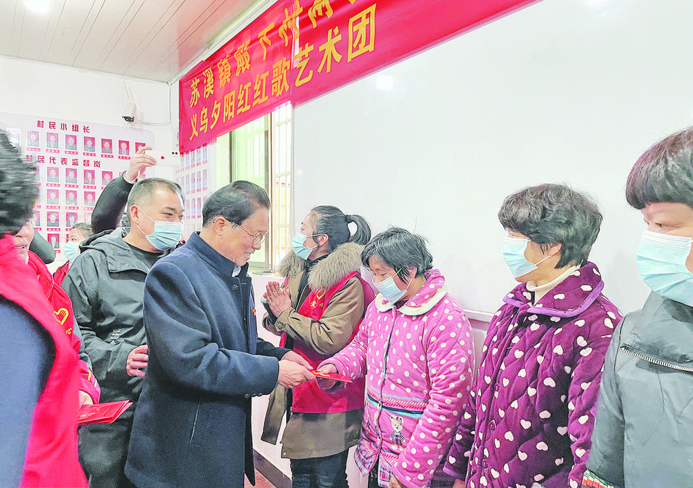 “來(lái)來(lái)來(lái),每人20斤大米,10斤花生油。祝你們?cè)诹x烏溫馨過(guò)年!1月24日,蘇溪鎮(zhèn)殿下村服務(wù)中心內(nèi),人聲鼎沸,笑語(yǔ)喧天。在市老年體協(xié)的牽頭組織下,由體協(xié)旗下的夕陽(yáng)紅藝術(shù)團(tuán)與愛(ài)心人士樓有德組織的“愛(ài)心小分隊(duì)”,前來(lái)慰問(wèn)殿下村“留義過(guò)年”的外來(lái)建設(shè)者。 當(dāng)日,殿下村約有170余名“留義過(guò)年”的外來(lái)建設(shè)者領(lǐng)取了慰問(wèn)品。此外,樓有德還給村里的5戶困難家庭每戶送上1000元的慰問(wèn)金。 |