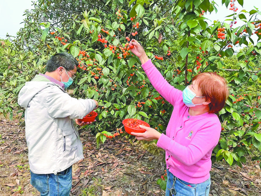 據(jù)當?shù)厝罕姺从,溪北村的櫻桃綠色無公害、口感好,深受消費者歡迎,近期前來基地采摘的游客絡(luò)繹不絕。該村的櫻桃種植面積從2007年不足10畝擴大到現(xiàn)在的300余畝。如今全村600余戶農(nóng)戶幾乎家家種植櫻桃,逐漸形成規(guī)模,成為遠近聞名的櫻桃種植村。每到櫻桃采摘季,四面八方的游客都會趕往溪北村,一邊欣賞田園風光,一邊采摘櫻桃。 今年60歲的蔣桂芳家里種了3畝櫻桃,目前主要是她和兒子兩個人負責管理。上周末,蔣桂芳的櫻桃園迎來近百名客人,僅周日一天的收入就達3000元!盀榱俗屜M者買得放心、吃得安心,村里在疫情防控上做足了準備。我們會提醒客人掃‘防疫碼’,并佩戴好口罩后進園采摘!笔Y桂芳介紹,“櫻桃要賣,疫情防控也不能放松!” 據(jù)悉,自4月10日起,溪北村兩委專門為櫻桃種植戶們發(fā)放了“防疫碼”,敦促其嚴格落實“人員出入管理、口罩佩戴、異常情況報告”等防疫要求,以此確保做好疫情防控工作的同時,保障農(nóng)民櫻桃銷售。村兩委帶領(lǐng)黨員和護村隊,每天對疫情防控工作進行巡查,村民們也自發(fā)地在村口當起“交通疏導(dǎo)員”。 考慮到疫情防控因素,在蘇溪鎮(zhèn)農(nóng)業(yè)部門、巧溪共建委指導(dǎo)下,溪北村及時調(diào)整生產(chǎn)與營銷策略,推出了“網(wǎng)絡(luò)推廣+線下近郊采摘游”模式,確保櫻桃產(chǎn)量不減,價格趨穩(wěn),銷售紅紅火火。 溪北村兩委負責人張階盛介紹,該村種植的櫻桃大多分為早熟、中熟、晚熟三個品種,每個品種的成熟時間不同,可以錯峰采摘,采摘時間從清明節(jié)后一直持續(xù)到“五一”假期。目前,果農(nóng)的訂單大多來自往年上門采摘的老客,以及網(wǎng)絡(luò)平臺帶來的自然流量。由于受疫情影響,一些散客沒有到現(xiàn)場采摘,但是目前銷售不成問題。 |