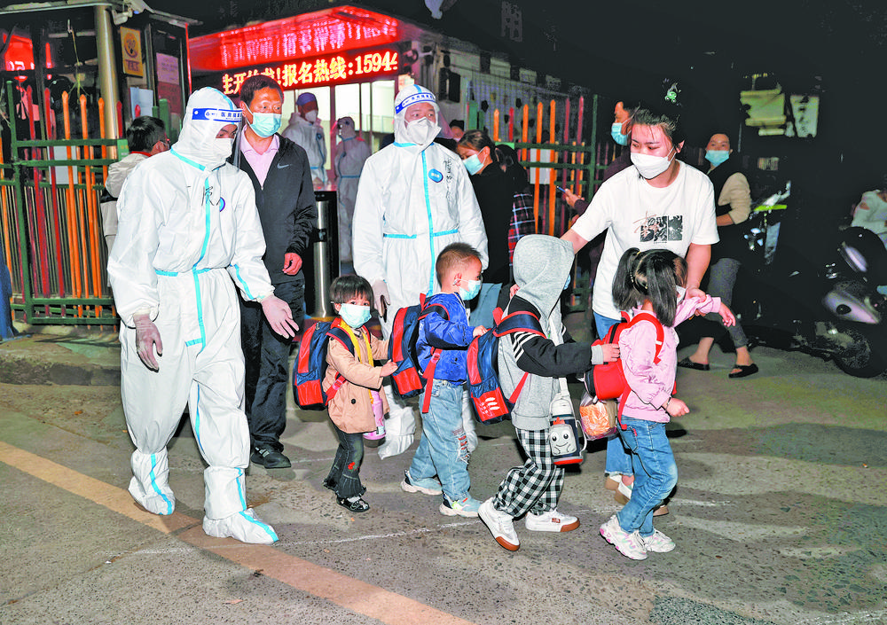 4月22日凌晨,市公安局全警堅守在疫情防控的各個崗位上,全力做好“三區(qū)”及周邊治安、交通秩序維護(hù),封控管理及群眾勸導(dǎo)等工作。圖為警察“大白”和老師們一起護(hù)送做完核酸檢測的孩子們回家。