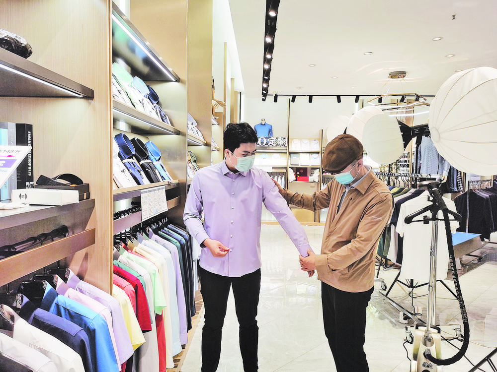 昨日,市民龔先生在商捷服飾展廳選購衣服。