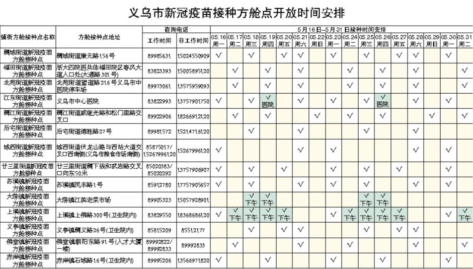 ▶提倡年滿3周歲以上、無(wú)疫苗接種禁忌人員新冠疫苗“應(yīng)接盡接”。為盡快建立全人群健康免疫屏障,請(qǐng)我市尚未接種人員盡快接種。 ▶年滿18周歲及以上已接種滅活疫苗,且已完成全程接種滿6個(gè)月的人群,請(qǐng)盡早盡快進(jìn)行加強(qiáng)劑次接種。 ▶接種請(qǐng)攜帶本人身份證,做好個(gè)人防護(hù),到以下接種點(diǎn)現(xiàn)場(chǎng)接種。 溫馨提醒: 1.江東街道方艙接種點(diǎn)周四不接種,由江東街道社區(qū)衛(wèi)生服務(wù)中心開(kāi)展新冠疫苗接種。 2.如遇特殊情況,接種安排以接種點(diǎn)最新通知為準(zhǔn)?商崆半娫捵稍兘臃N點(diǎn)。 3.3-17周歲人群接種提示:可就近到接種點(diǎn)接種。接種疫苗時(shí)需要監(jiān)護(hù)人陪同,并提供由監(jiān)護(hù)人簽字的知情同意書(shū)。 來(lái)源:義烏市衛(wèi)生健康局 |