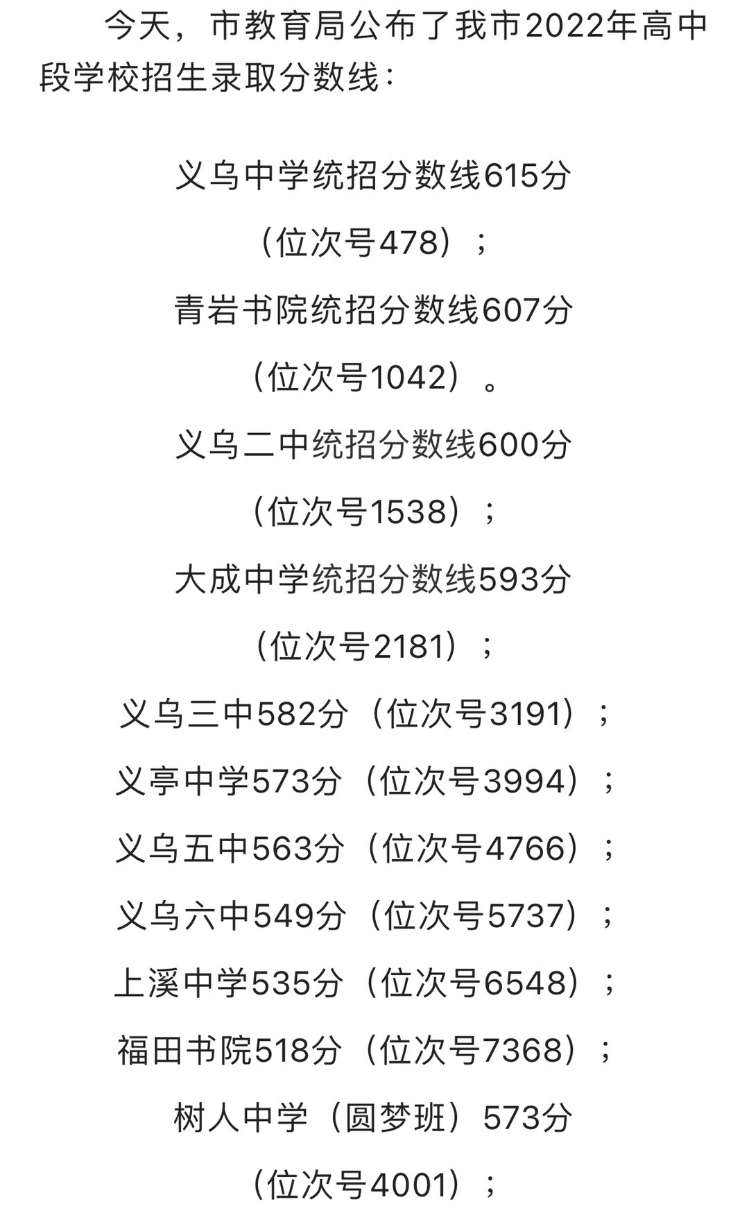 義烏市2022年高中段學(xué)校招生錄取分?jǐn)?shù)線公布